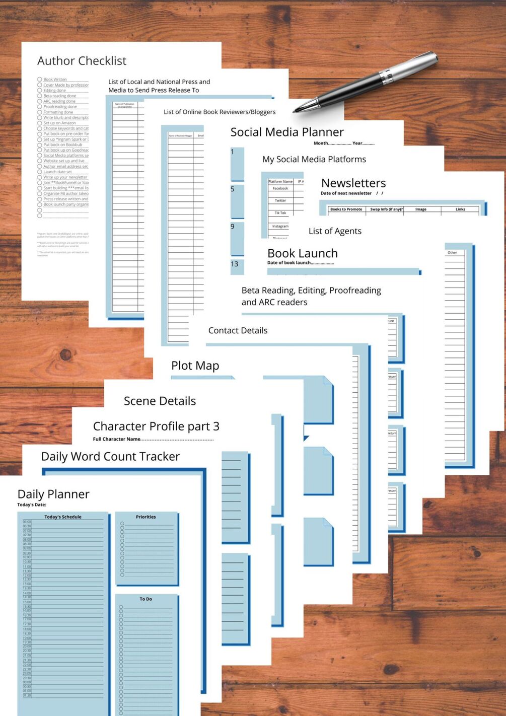 This terrific pdf 15-page printable writer's planner will help you plan your next novel,. This includes a daily word tracker, social media tracker, plot maps, scene details, character profile and more. Available in A4 and US letter sizes.